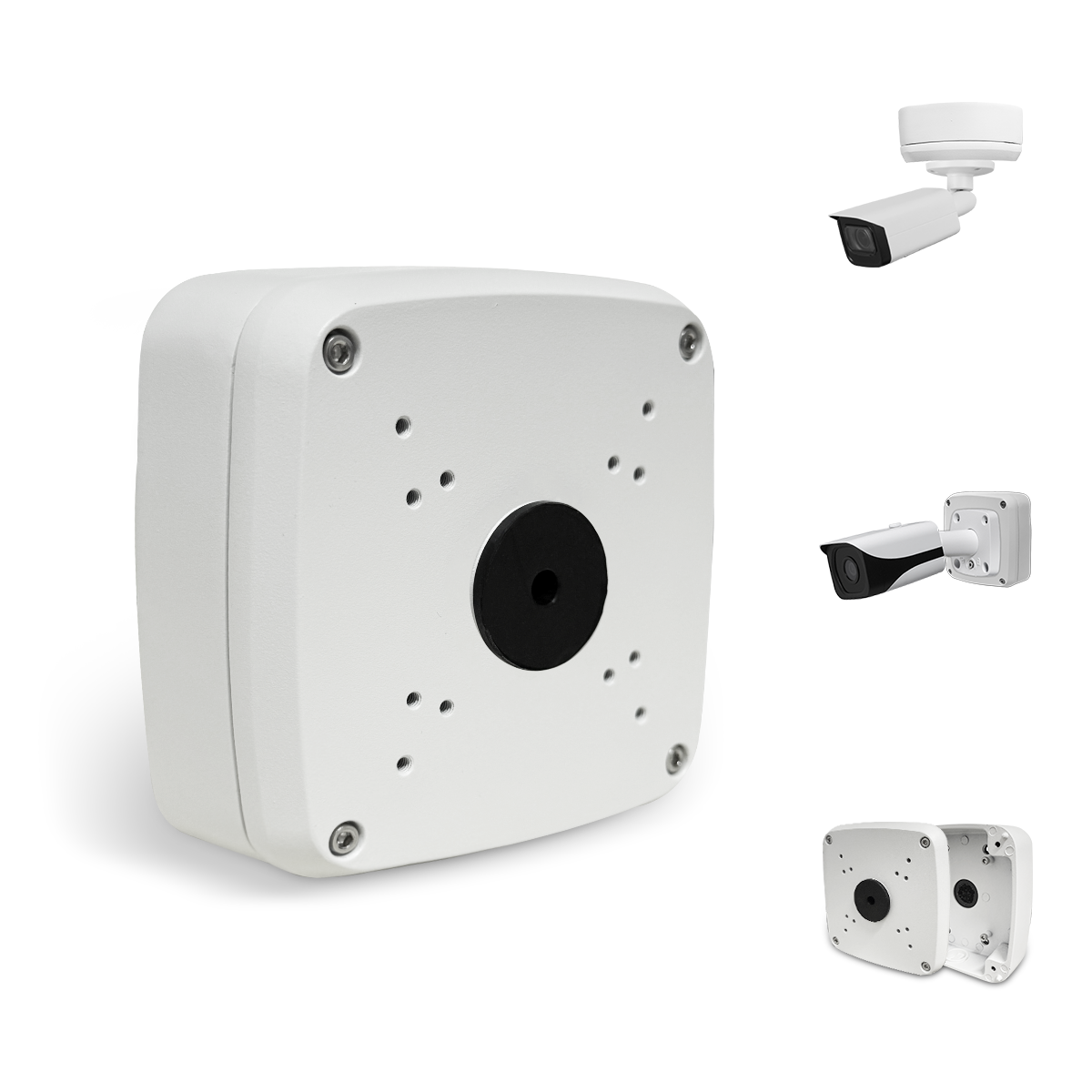 Especificaciones del producto: Medidas 5" x 5" x 2". Caja de conexiones para montaje en superficie, fabricada en metal y caucho con acabado blanco. Diseñada para ser compatible con cámaras de vigilancia tipo bala DAH. La instalación requiere perforar los orificios necesarios.