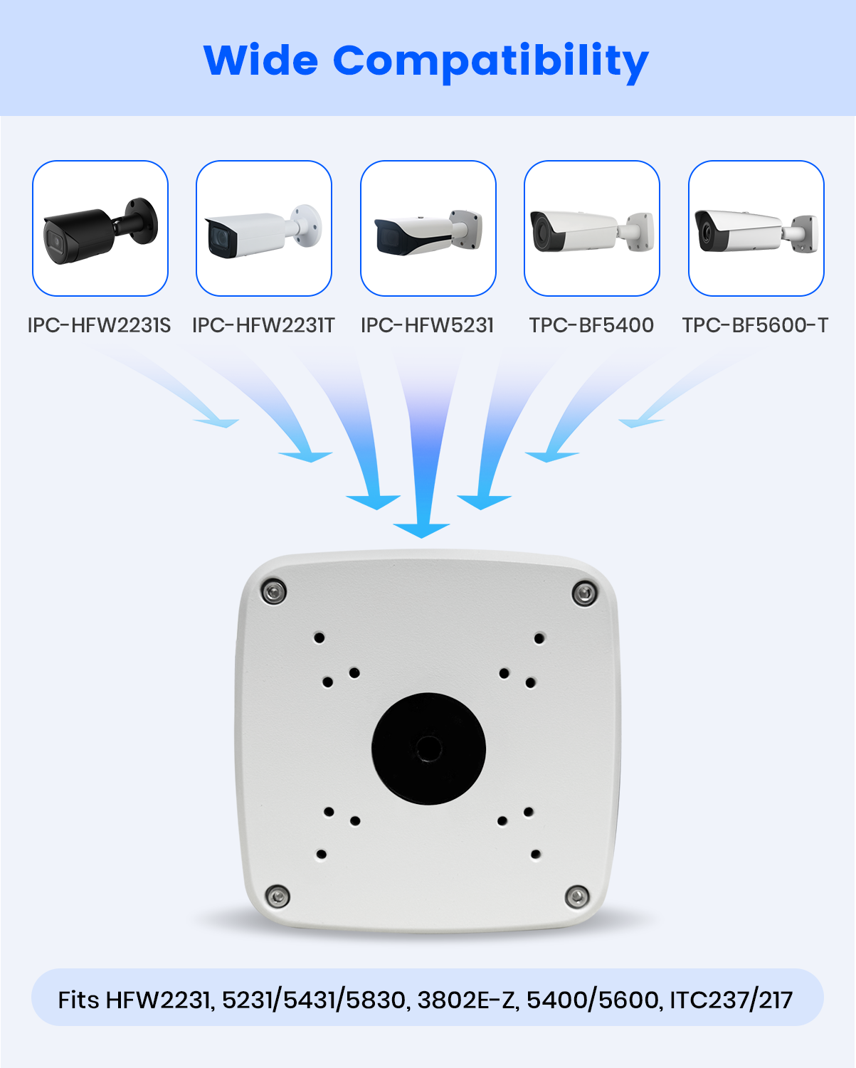 - Amplia compatibilidad: compatible con varias cámaras bala DAH, térmicas y ANPR, incluidos modelos populares como HFW2231, IPC-HFW5231/5431/5830 Series, HFW3802E-Z, TPC-BF5400/5600 y ITC237/217 Series.